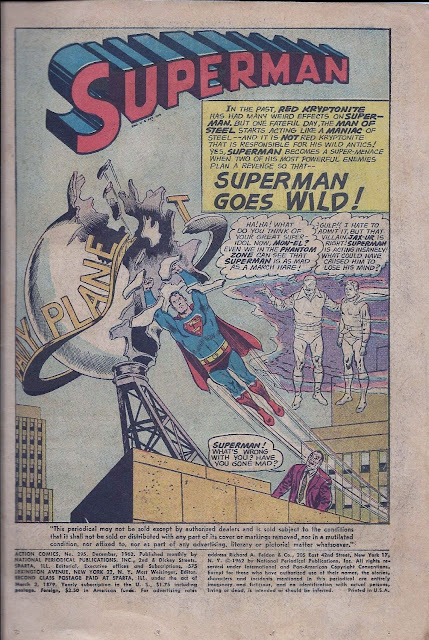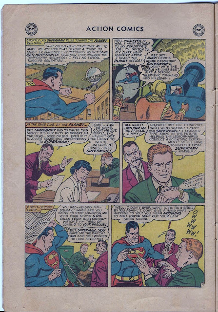 KAV: Here we go with another one of those stories where Superman turns evil. This happens so often you'd think everyone was used to it by now but no. In the splash page I notice the Daily Planet globe is smaller than usual. I noticed this about his fortress key also-it varies in size more often than Gary Busey's bank account.