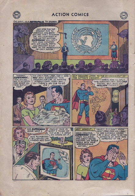 KAV: Ok Superman comes out with the largest diamond ever-and he's going to break it into smaller diamonds. This is stupid-diamond cutters always try to keep a diamond as large as possible, only cutting it to remove flaws. This is taking a billion dollar diamond and cutting it into 103 pieces which are worth 5 million each, effectively halving its total value. Stupid.