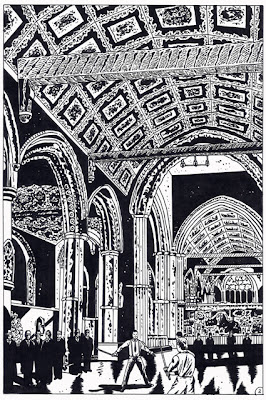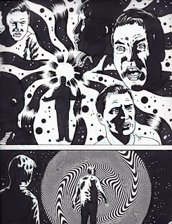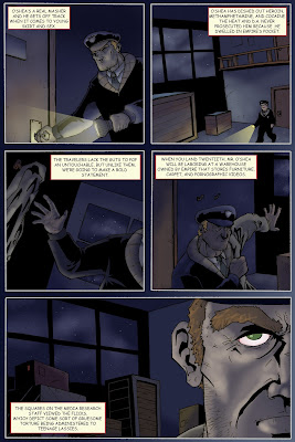 This page is much better in style because it shows Donovan Page lurking in the shadows and panel three introduces Denny O'Shea. Page was not shown in the original first page, but was referenced in name only. The black and grey color works very well and this is the style I wanted for our story. The first page has been successfully completed.