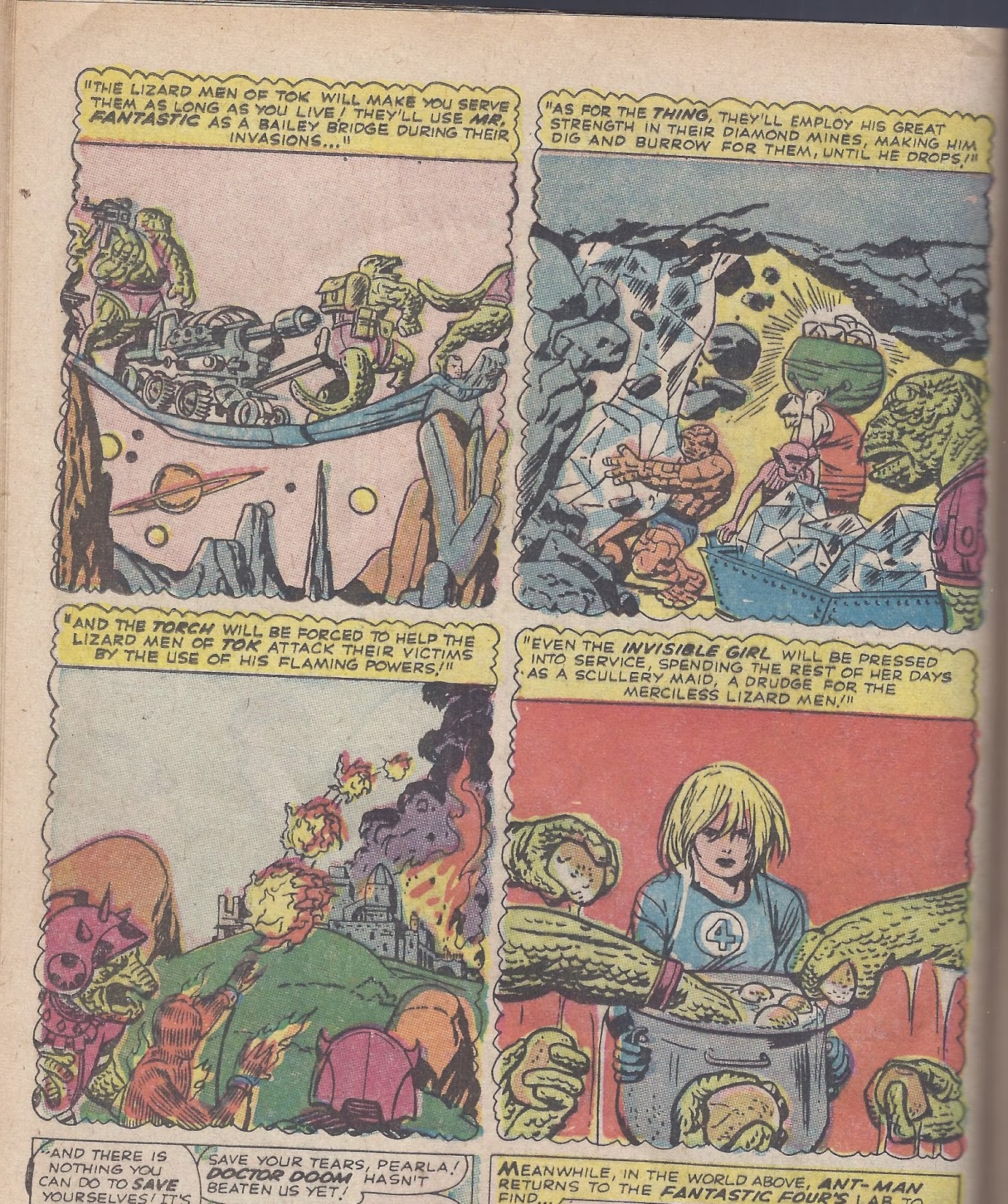 Fantastic Four #16. Dr Doom is trading the Fantastic Four to an alien race and apparently it is worth it to them to have a guy who can become a bridge, some dude to pound rocks, a human torch because they aren't advanced enough to develop flame throwers even though they have advanced beam weapons etc., and YIKES....a scullery maid! Sue Storm definitely needs a celebrity makeover! For this they trade world-conquering technology to Doom. They're like those little kids that you can trade a 'big' nickel for a 'small' dime. They must have got off the short spaceship I guess.